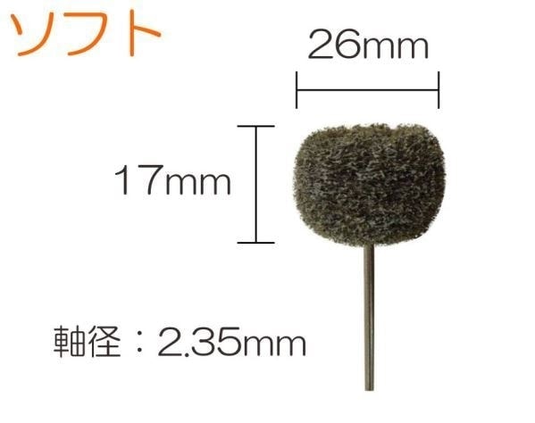 ヘアラインブラシ、ソフト 軸径:Φ2.35mm ヘアライン修正、粗研磨、鋳造上がりの素材の表面処理に最適な軸付バフです。 |