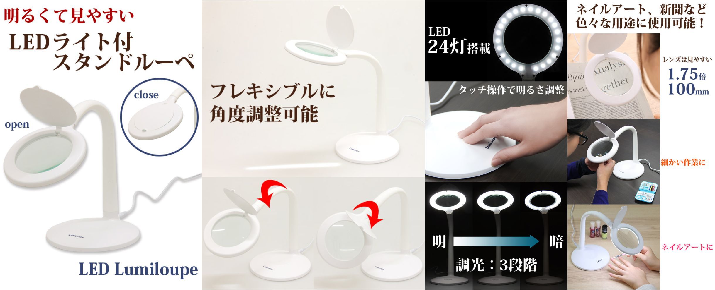 卓上LEDルーペ1.75倍 LumiLoupe LEDライト付きのスタンドルーペで調光は3段階調整可能です。細かい作業、検査など用途は様々です。 4,750円(税別) |