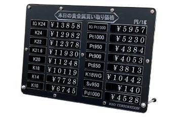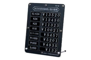 貴金属買取りプライスボード(L) 寸法:W 380×H 260mm 16種類の価格の提示ができるプライスボードです。 68,800円(税別) |