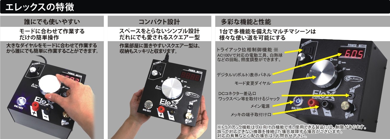 60Vの高出力がエレックスの特徴の一つです。通常のメッキ、金メッキ・ロジウムメッキ等はもち