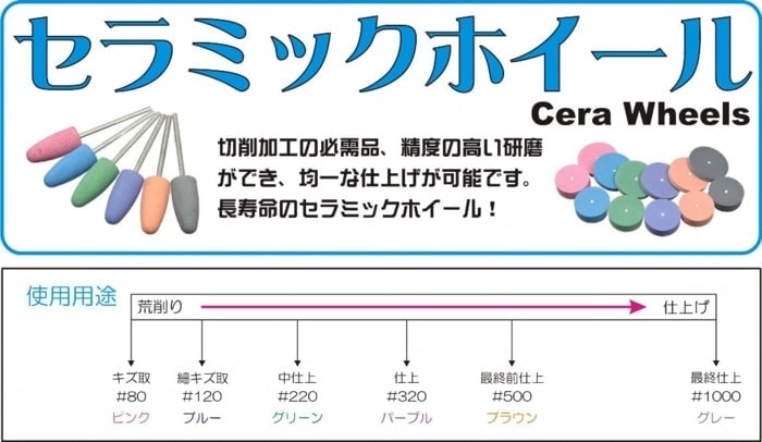 セラホイールの特徴は従来のシリコンポイントよりも何十倍も長持ちします。貴金属研磨の他にも、